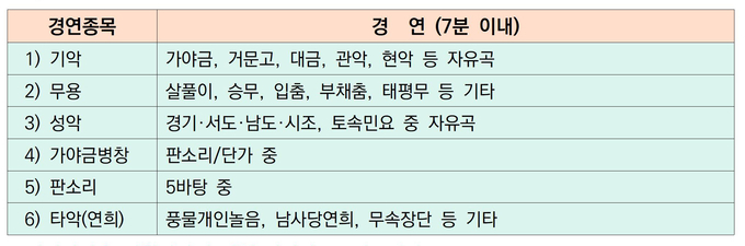 • 종목 : 무용, 기악, 성악, 가야금병창, 판소리, 타악(연희)