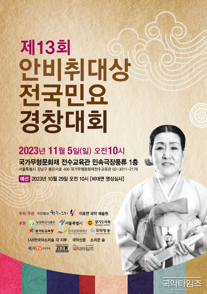 故안비취 명창을 기리기 위해, 사단법인 한국의소리 숨에서 주최하는 민요경연대회로서 전국의 경기민요 신인들을 발굴·육성하는 권위있는 국악 등용문으로 정착시키고, 경기민요의 전승과 보급에 기여하고자 하는 대회입니다. 국악의 대중화는 물론 우리문화의 세계적인 진출과 전통민요의 위상을 한층 더 높이는데 그목적을 두고 있습니다.