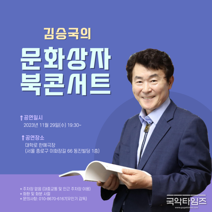 김승국 전통문화콘덴츠연구원장의 북콘서트가 11월 29일 오후 7시 30분에 대학로 한예극장(구 정미소 소극장)에서 열린다. 이번 행사는 김승국 원장의 새로운 칼럼집 "<김승국의 문화상자>" 출간을 기념하기 위해 문화 · 예술계 후배들과 제자들이 주선하여 마련되었다.