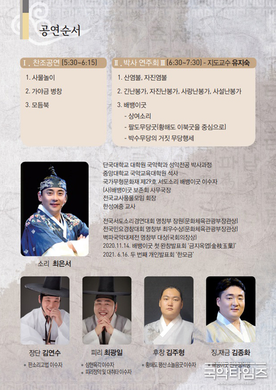 한성여자중학교 교사이고 단국대학교 대학원(박사과정) 국악학과에서 성악을 전공하는 최은서의 세 번째 소리 발표회가 2022년 6월 10일 오후 5시30분 삼성동에 위치한 한국문화의 집 코우스에서 단국대학교 대학원 국악학과가 주최/주관하고 사단법인 배뱅이굿 보존회가 후원하는 박사 연주회가 막을 올린다.