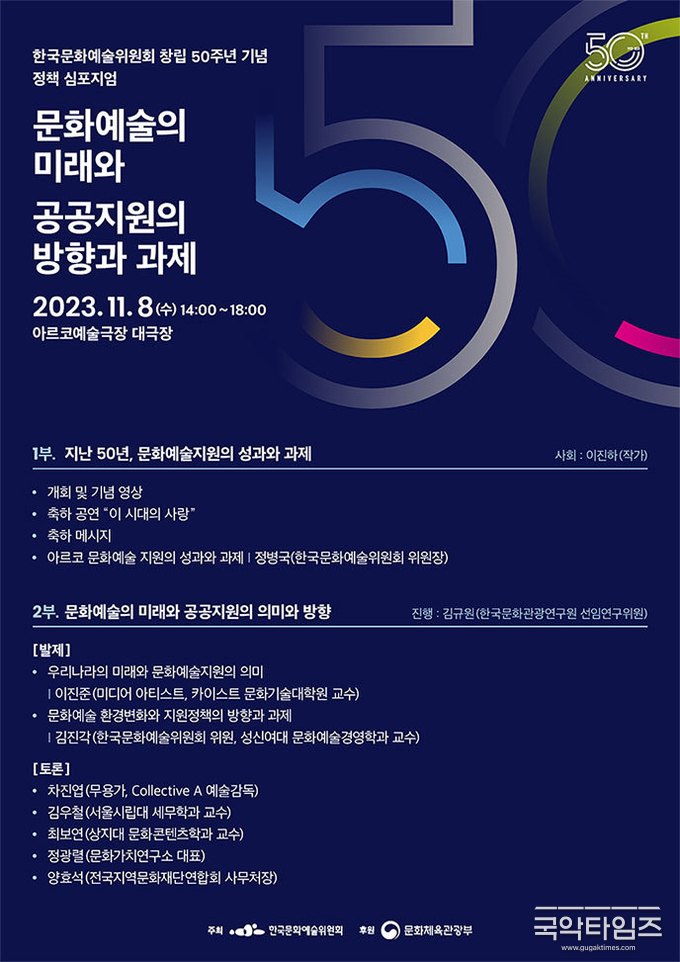 한국문화예술위원회(위원장 정병국, 이하 예술위)는 한국문화예술위원회 창립 50주년을 맞이하여 오는 11월 8일(수) 오후 2시 아르코예술극장 대극장에서 <아르코 50주년 기념 정책 심포지엄(이하 심포지엄)>을 개최한다.