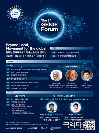 국악타임즈 송혜근 기자 | 전북특별자치도는 10월 23일부터 24일까지 전북대학교 진수당 일원에서 '글로벌 금융 네트워크 중심을 향한 움직임'을 주제로 제5회 지니포럼(GENIE Forum)을 개최한다고 밝혔다.