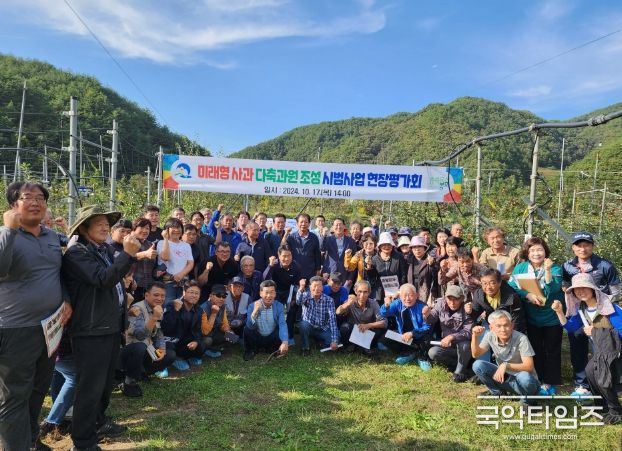 국악타임즈 송혜근 기자 | 봉화군은 지난 17일 소천면 착한사과농원에서 미래형 사과 다축과원 조성 시범사업 현장평가회를 개최했다.