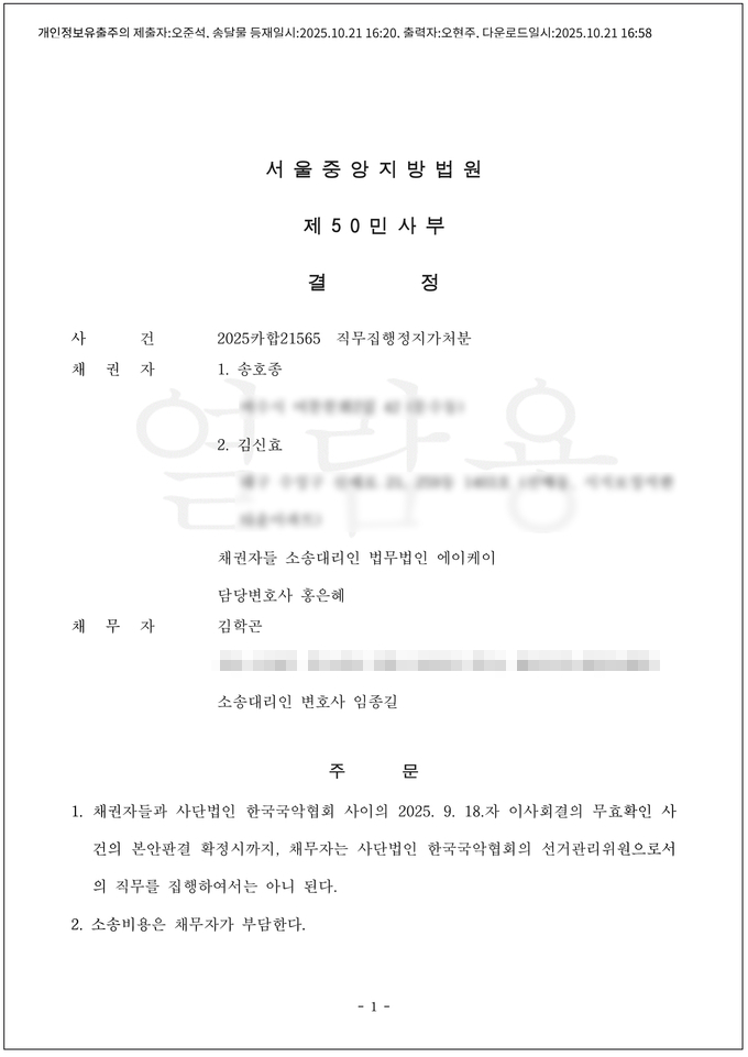 한국국악협회 지회장 중심의 비상대책위원회(이하 비대위)가 선거관리위원장 김학곤을 상대로 제기한 ‘직무집행정지 가처분’ 신청에 대해, 서울중앙지방법원 제50민사부(재판장 김상훈 판사)는 2025년 10월 21일자로 신청을 인용하였다. 이로써 김학곤은 향후 한국국악협회 선거와 관련한 일체의 직무를 수행할 수 없게 되었다.
