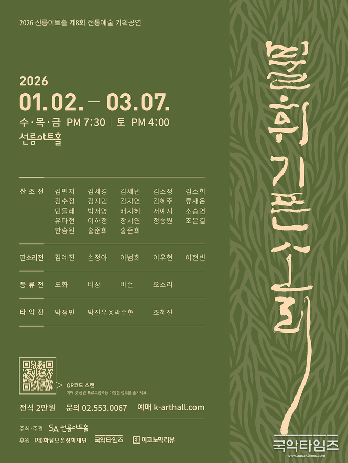 지난 1월 2일 막을 올린 선릉아트홀의 전통예술 기획공연 ‘2026 선릉아트홀 제8회 불휘기픈소리’가 관객들의 호응 속에 2월과 3월 무대를 이어간다. 이번 공연은 오는 3월 7일까지 약 두 달간 30여 회에 걸쳐 진행되며, 전통예술의 현재와 깊이를 집중적으로 조명한다.