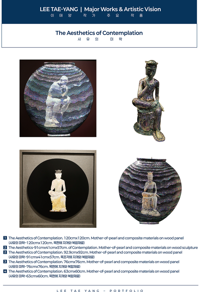 이번 전시의 핵심은 ‘사유의 미학’에서 출발한다. 작가는 불교의 반가사유상과 서양의 로댕 ‘생각하는 사람’을 동시에 매만지며 인간이 시대와 문화를 넘어 공유해온 사유의 본질을 탐색한다. 삶의 고통과 번민 앞에서 인간은 언제나 생각하고 그 사유의 깊이 속에서 지혜를 길어 올린다. 이태양은 그 보편적 사유를 빛의 조형으로 끌어올리는 작가이다.
