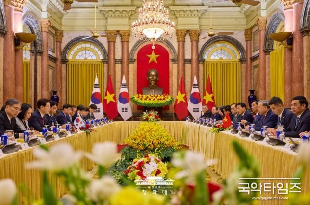 국악타임즈 편집부 | 베트남을 국빈 방문 중인 이재명 대통령은 22일(현지시간) 오후 베트남 국가주석궁에서 또 럼 당서기장 겸 국가주석과 정상회담을 갖고, 양국 간 포괄적 전략 동반자 관계 발전 방안과 지역·국제 정세 등에 대해 심도 있게 논의했다고 이규연 청와대 홍보소통수석이 서면 브리핑했다.