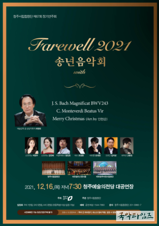 국악타임즈 송인숙 기자 | 청주시립합창단(예술감독 겸 상임지휘자 차영회)은 오는 12월 16일 저녁 7시 30분 청주예술의전당 대공연장에서 선보이는 ‘Farewell 2021 송년음악회’ 티켓 예매를 11월 8일 오후 2시부터 공연세상을 통해 시작한다.