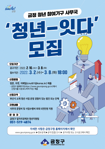 부산 금정구(구청장 정미영)는 올해 지역 특성에 맞는 청년정책 거버넌스 활성화를 위해 '금정 청년 참여기구 사무국 '청년-잇다''를 신규 공모한다.
