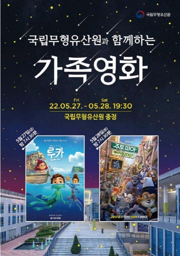 문화재청 국립무형유산원(원장 이경훈)은 5월 27일부터 28일까지 오후 7시 30분부터 국립무형유산원 야외 마당(전북 전주시 소재)에서 가족영화를 무료로 상영한다.
