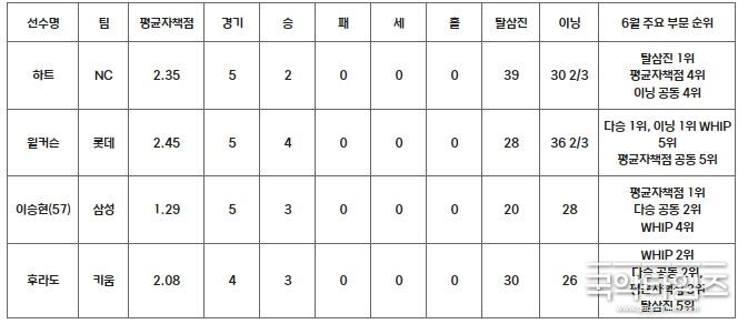 이번 시즌을 앞두고 선발로 전환한 삼성 이승현은 보직이동 후 가장 좋은 한 달을 보냈다. 5경기에 등판해 28이닝 동안 4자책점만을 기록하며 평균자책점 1.29로 이 부문 1위에 올랐다. 또한 이번 시즌 월별 기록에서 처음으로 평균 5이닝 이상을 던지며 이닝 소화력을 점점 끌어올리고 있다. 이승현이 6월의 활약을 계속해서 이어나간다면 삼성은 든든한 국내 선발 에이스를 한 명 더 얻게 된다.