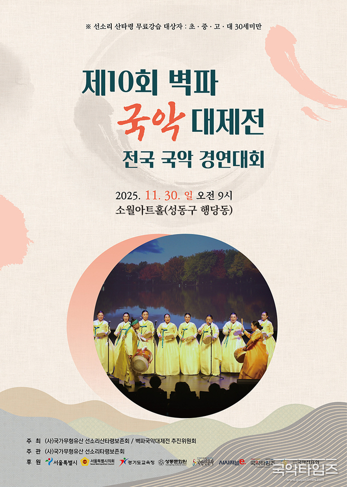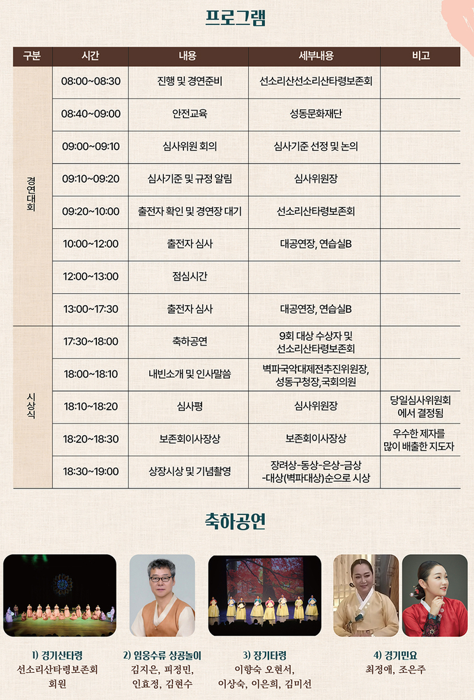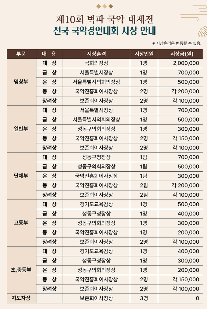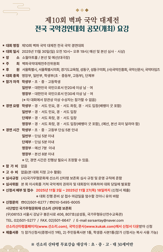 제6회 송파전국국악경연대회 모집요강 ◈ 목 적 2천년 전 찬란한 문화를 꽃 피웠던 백제 한성기의 옛 도읍지인 서울 송파에서 「제6회 송파전국국악경연대회」를 개최하여 우리 고유의 문화유산인 전통음악 대중화 및 우수한 국악인들을 배출하고자 함. ◈ 대회일정 ◆ 예 선: 2025.09.06.(토) 09:00~18:00 / 송파문화원(비대면 영상심사) ◆ 본 선: 2025.09.20.(토) 08:00~19:00 / 서울놀이마당 ◆ 시상식: 2025.09.20.(토) 17:00 - 예정 ◈ 참가자격 ◆ 초/중/고등부: 재학생 및 청소년, 비취학 청소년일 경우 그 연령의 준한 부문에 참가 가능. (비취학 청소년은 검정고시, 대안학교, 홈스쿨링 등 적용, 단 고등학교 졸업자는 제외) ◆ 일반부: 대한민국 국적의 만19세 이상의 일반인 (재수생, 대학생, 대학원생 등 포함) ◆ 단체부: 4인이상 또는 8인이상의 타악(연희, 사물놀이, 풍물) 단체 ◈ 참가제한 (모든 부문에 해당) ◆ 1인 1부문에 한함. (개인과 단체 지원 중복 불가) ◆ 본 대회 종합대상 또는 장원 수상의 입상 경력이 있는 자 ◆ 해당 중요 무형문화재 예능 보유자 또는 보유자 후보 및 해당분야 대통령상