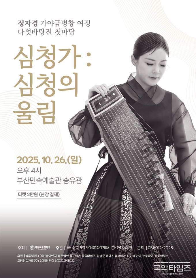 오는 10월 26일(일) 오후 4시, 부산민속예술관 송유관에서 정자경 가야금병창 여정 다섯바탕전 첫마당 '심청가: 심청의 울림’이 막을 올린다. 이번 공연은 가야금병창 연주자 정자경이 전통 판소리의 서사와 가야금 선율의 감성을 결합해 선보이는 첫 번째 프로젝트로, 고전과 현대의 정서를 잇는 의미 있는 시도다.