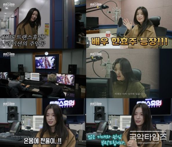 'KBS 다큐' 유튜브 채널에 올라온 메이킹 필름 영상에서는 밝은 표정으로 녹음실에 들어선 한효주가 꾸미지 않은 내추럴한 미모로 먼저 감탄을 자아냈다.