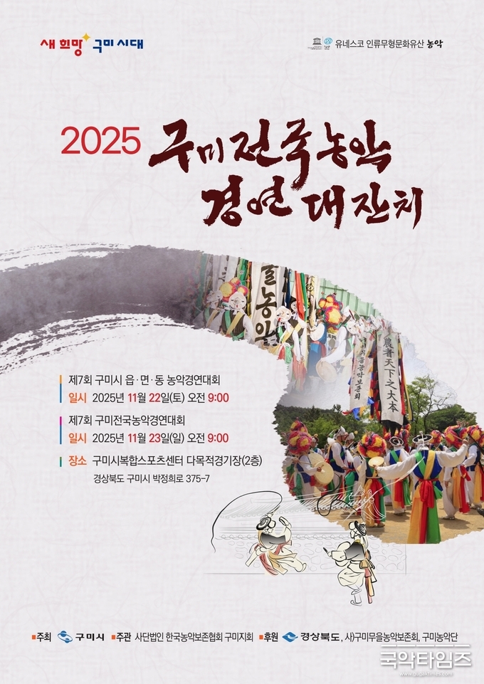 2025 제7회 구미전국농악경연대잔치, 이번 주말 구미를 전통의 울림으로 물들일 예정, 전국 농악인들 집결… 명인전·축하공연·경연이 어우러질 대규모 잔치 기대