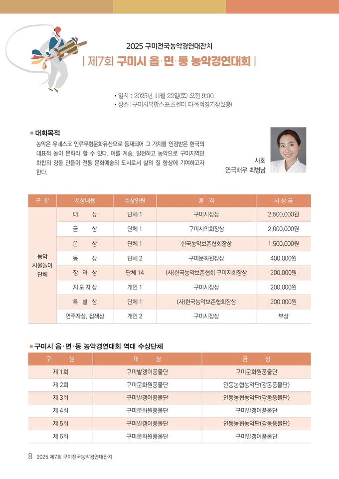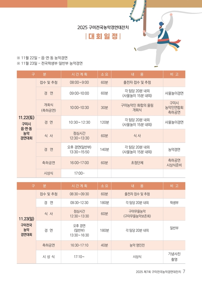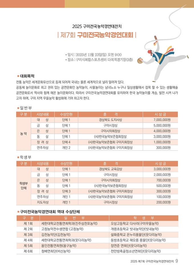 다음은 2025 구미전국농악경연대회 대회일정과 대회 목적, 시상내용이다.