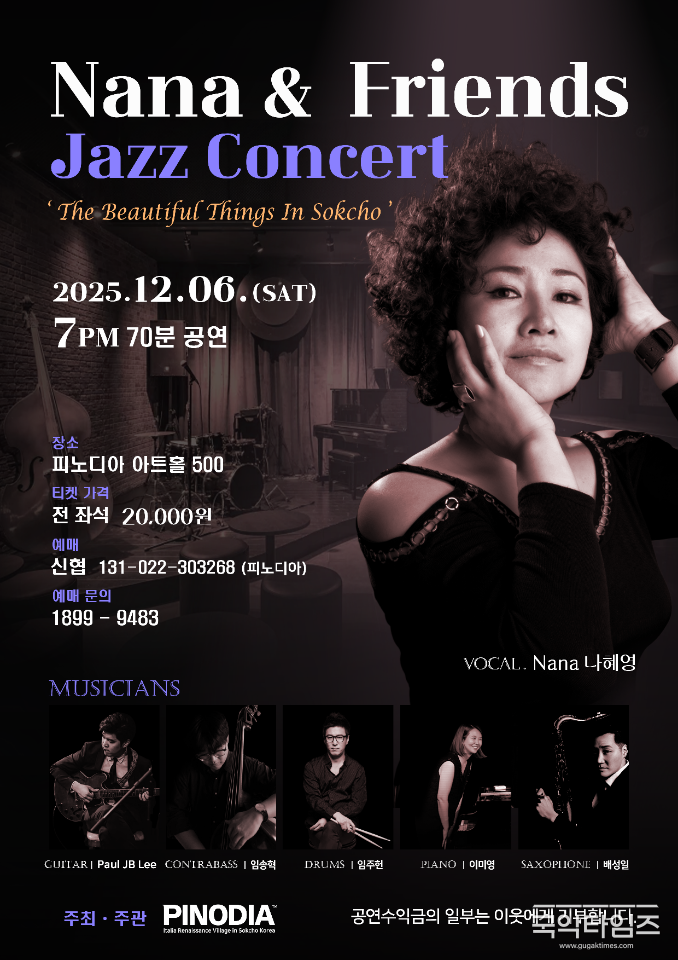 재즈 보컬리스트 나혜영(나나)과 국내 정상급 연주자들이 함께하는 ‘Nana & Friends Jazz Concert’가 오는 2025년 12월 7일(일) 저녁 7시, 속초 피노디아 아트홀 500에서 열린다. 이번 공연은 연말을 맞아 피노디아가 지역 주민과 관광객에게 감사의 뜻을 전하고자 마련한 특별 초청 무대다.