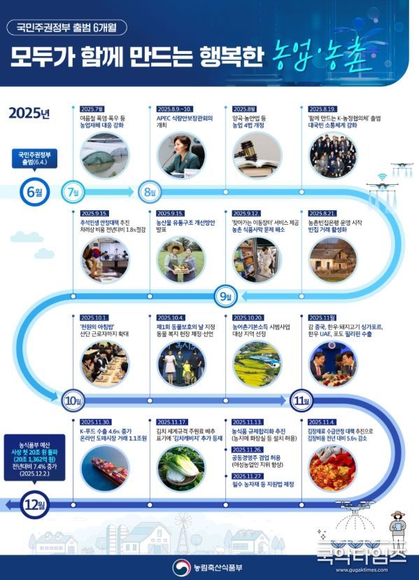 국악타임즈 편집부 | 농림축산식품부는 새 정부 출범 후 약 6개월동안 정책의 연속성과 과감한 혁신 기조 하에서 현장에서 체감할 수 있는 변화를 이끌어 내는 동시에, 만성적 쌀 공급 과잉, 농촌 고령화 등 농업·농촌의 구조적 문제 해결과 희망을 실현하는 농업·농촌을 만들기 위해 전력을 다하고 있다.