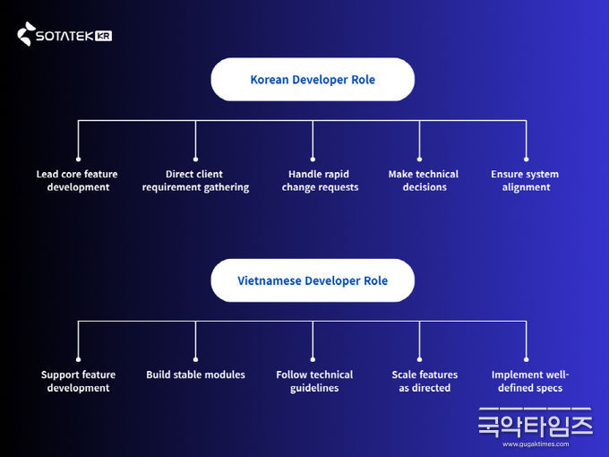 최근 국내 IT 업계에서는 한국 개발자와 베트남 개발자 간의 역할 분담이 더욱 명확해지는 추세다. 한국 개발자들은 핵심 기능 개발을 주도하며, 고객사로부터 요구사항을 직접 수집해 신속하게 대응하는 역할을 맡고 있다. 또한 기술적 의사결정을 수행하고 시스템의 전체적인 방향성을 관리하는 등 프로젝트의 전략적 중심축을 담당한다.