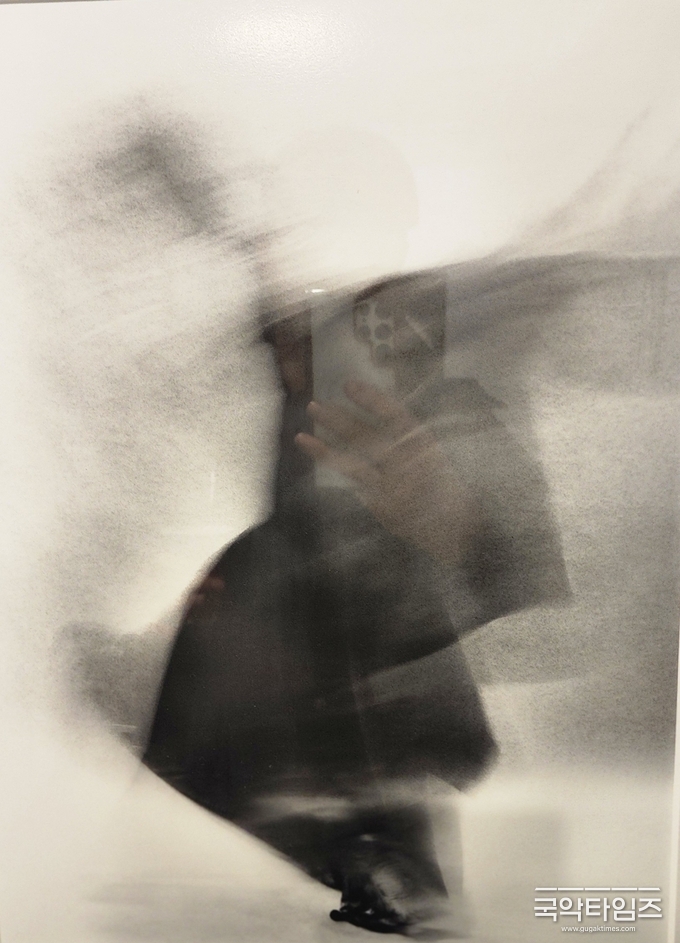 ‘풀빛여행’에서 몸은 분명 존재하지만, 끝내 온전히 포착되지 않는다. 춤꾼의 얼굴과 팔다리는 흐릿해지고, 남는 것은 휘돌아간 선과 먹빛의 흔적이다. 이는 라캉이 말한 상상계의 붕괴에 가깝다. 하나의 완결된 이미지로서의 몸은 해체되고, 주체는 더 이상 자신을 명확한 형상으로 소유하지 못한다. 전통춤은 여기서 특정 동작이나 장단의 재현이 아니라, 한을 넘어서는 순간에 발생하는 균열로 기록된다. 작가는 셔터를 통해 동작을 붙잡기보다, 시간을 풀어놓는다. 그 결과 사진은 정지된 이미지임에도 끊임없이 흔들린다. 이는 욕망이 결코 하나의 이미지로 고정되지 않는다는 사실을 시각적으로 증언한다. 소리와 몸이 멎은 뒤에도 계속 울리는 잔향, 민요 속 ‘놀자’라는 말이 삶을 지속시키는 최소한의 생기가 되는 순간, 신명은 쾌락이 아니라 견딤의 형식으로 나타난다.