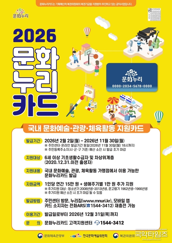 취약계층의 문화향유 기회를 넓히기 위한 2026년 문화누리카드 발급이 2월 2일부터 시작된다. 문화체육관광부는 올해 통합문화이용권(문화누리카드)의 연간 지원금을 전년 대비 1만 원 인상한 15만 원으로 확정하고, 청소년(13~18세)과 생애전환기(60~64세) 대상자에게는 1만 원을 추가 지원해 최대 16만 원을 지급한다고 밝혔다.