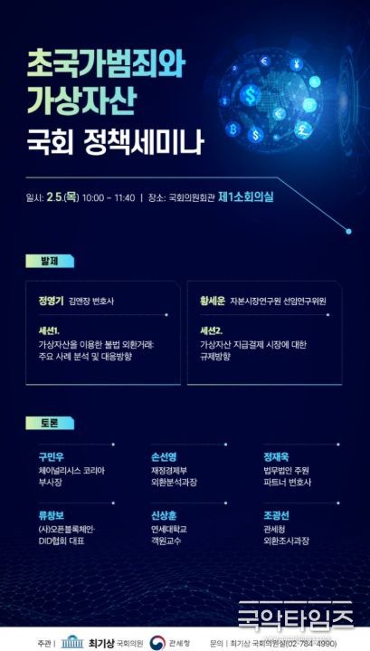 국악타임즈 편집부 | 관세청은 최기상 국회의원(더불어민주당·서울 금천구)과 공동으로 2월 5일 국회 의원회관에서 '초국가범죄와 가상자산: 국경을 넘어선 불법 자금 흐름 대응' 국회 정책 세미나를 개최했다.