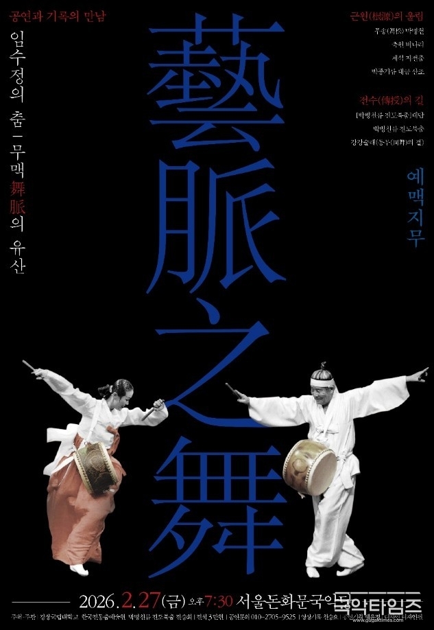 경상국립대학교 민속예술무용학과 교수이자 한국전통춤예술원 대표인 임수정은 오는 2026년 2월 27일(금) 오후 7시 30분, 서울돈화문국악당에서 <예맥지무(藝脈之舞)>를 개최한다. 이번 무대는 ‘공연과 기록의 만남’을 주제로, 전통춤의 계승과 보존이라는 시대적 과제를 예술적으로 풀어낸다.