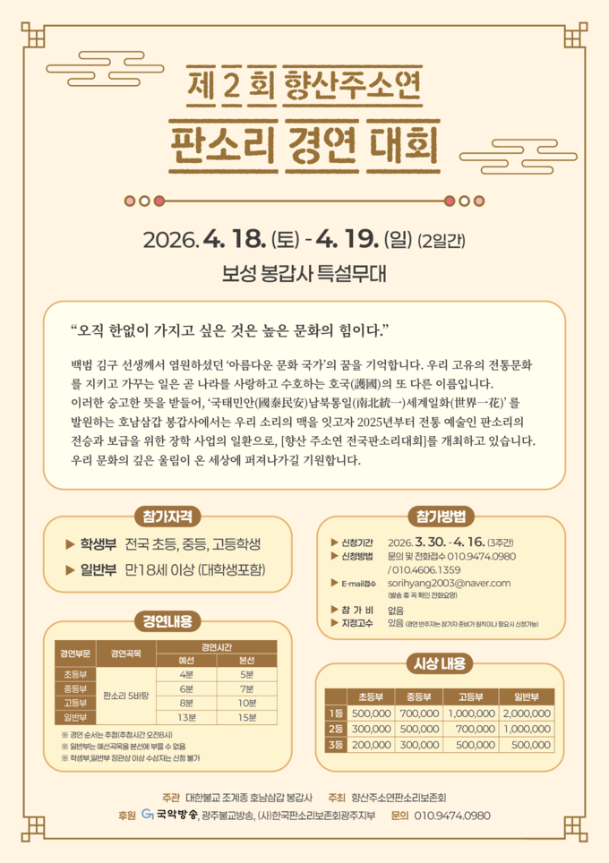 제4회 삼국유사 전통음악전국경연대회 요강 기 간 : 2025.10. 25.(토요일-예, 본선) 장 소 : 인각사 특설무대(대구광역시 군위군 삼국유사면 삼국유사로 250/☎054-383-1161) 주 최 : 대한불교조계종인각사 주 관 : 삼국유사전통음악경연대회 조직위원회, 도지정전문예술단체 손양희국악예술단 후 원 : 대한불교조계종 총무원, 대한불교조계종 제10교구 본사 은혜사, 문화재청, 대구광역시청, 군위군, 대구광역시교육청 특별후원 : 홈센타홀딩스, 보광산업 경연부문 ▷판소리 : 초등부, 중등부, 고등부, 신인부, 일반부 ▷민요 : 초등부, 중등부, 고등부, 신인부, 일반부 참가자격 ▷일반부 – 대학생(전공자)을 포함한 만 18세 이상의 모든 남, 여 ▷신인부 – 만18세(비전공자) 이상의 모든 남, 여 ▷초, 중, 고등부 – 초, 중, 고등학교에 재학 중인 학생 또는 이에 준하는 자 경연시간 참가비, 고수비 : 전체 없음. : 전체 없음. 경연시간 안내 ※ 접수확인 및 순번표 배정(시간엄수) : 접수처(안내처) ▷08:30~08:50 (고등부, 일반부), ▷10:00~10:20(신인부, 초등부, 중등부) ※ 예선 진행 (극락전-판소리) : (고등부)09: