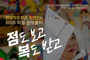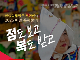 K-데몬헌터스, 현실 무대로 확장… 무속의 치유를 공연으로 만나다. 잔치마당 ‘문화가 있는 날’ 특별공연, 조경자 만신과 함께하는 체험형 무속 예술 국악전용극장 잔치마당이 3월 ‘문화가 있는 날’을 맞아 무속과 공연예술의 경계를 확장하는 특별한 무대를 선보인다. 오는 3월 25일 오후 7시 열리는 2026 병오년 특별공연 「점도 보고, 복도 받고」는 황해도 무속인 조경자 만신을 초청해 전통 의례를 공연 형식으로 재구성한 기획이다. 이번 공연은 최근 글로벌 콘텐츠로 주목받고 있는 넷플릭스 애니메이션 ‘K-Pop Demon Hunters(케이팝 데몬 헌터스)’가 보여준 무속적 상상력을 현실 무대로 확장한 사례라는 점에서 주목된다. 작품 속에서 아이돌의 무대가 굿이 되고, 퍼포먼스가 악귀를 달래고 치유하는 의례로 작동하는 설정은 한국 무속이 지닌 본질적 구조 -흥과 한, 위로와 해원의 감각-를 현대적으로 재해석한 것이다. 잔치마당은 이러한 흐름을 단순한 재현이 아닌 ‘현장 예술’로 구현한다. 조경자 만신은 실제 점사와 의례를 통해 관객과 직접 소통하며, 무속이 단순한 신앙을 넘어 공동체를 연결하고 삶을 위로하는 예술 행위임을 드러낸다. “점도 보고, 복도 받고”…
