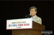 국악타임즈 편집부 | 서울 중구가 제29회 노인의 날(10월 2일)을 기념해 지난 2일 중구 구민회관 대강당에서 기념식과 함께 어르신 어울림 한마당을 열었다. 이날 행사에는 어르신과 내빈 등 500여 명이 참석해 어르신들에 대한 노고에 존경과 감사를 표했다. 1부에서는 노인 복지와 지역 발전을 위해 헌신하신 65세 이상 모범어르신 3명과 노인복지 기여자 9명, 기여 단체 1곳에 표창이 수여됐다. 2부 행사에서는 초대가수 축하공연과 어르신 장기자랑이 펼쳐졌다. 어르신으로 구성된 11팀이 무대에 올라 노래와 악기 연주 실력을 뽐내며 흥겨운 시간을 만들었다. 김 구청장도 '고맙소'라는 노래를 불러 어르신들의 호응을 얻었다. 행사장 로비에는 영양 건강 체험 부스가 마련되어 어르신들이 드신 식사의 칼로리와 나트륨양 등을 직접 계산해보고 균형잡힌 식사법에 대한 상담도 받을수 있었으며, 추척사진관 부스에서는 교복을 입고 사진을 찍으며 옛 추억을 떠올렸다. 행사에는 한국삭도공업주식회사, 대신자산신탁, 한마음라이온스, 중구자원봉사센터를 비롯한 여러 업체와 기관이 경품, 기념품, 간식 등을 후원해 더욱 풍성하게 진행됐다. 참석한 어르신은 “오늘 이날만 기다렸다. 신나는 공연에