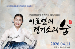 전통의 깊은 울림, 무대 위에 피어나다... 이호연 명창, ‘경기소리 숨’으로 경기민요의 정수 선보여 국가무형유산 경기민요 예능보유자 이호연 명창이 오랜 시간 갈고닦은 소리의 정수를 무대 위에 펼친다. 오는 4월 11일 오후 5시 30분, 국가무형유산 전수교육관 민속극장 풍류에서 열리는 2026 국가무형유산 전승지원 기획공연 ‘이호연의 경기소리 숨’은 전통의 깊은 울림과 현대적 감각이 어우러지는 무대로 관객을 맞이한다. 이번 공연은 경기12잡가와 경기민요를 중심으로 구성되어, 경기소리 특유의 섬세한 감성과 유려한 선율을 입체적으로 조명한다. 단순한 재현을 넘어 소리와 몸짓, 연희적 요소가 결합된 무대 구성으로, 전통예술의 현재성과 확장 가능성을 동시에 보여주는 자리다. 경기12잡가부터 아리랑 연곡까지… 전통의 흐름을 잇다 공연은 경기12잡가 ‘선유가’를 시작으로 ‘방물가’, ‘출인가’, ‘금강산타령’, ‘사발가·양류가·도화타령’ 등 다채로운 경기민요 레퍼토리로 이어진다. 특히 ‘정선아리랑’, ‘한오백년’, ‘강원도아리랑’으로 이어지는 아리랑 계열 곡들은 우리 민족 정서의 깊이를 전하며, 마지막 ‘아리랑연곡’에서는 전 출연진과 관객이 함께 호흡하는 무대로 마무