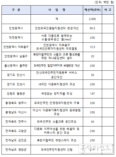 국악타임즈 관리자 기자 | 내년에 외국인주민과 북한이탈주민의 기초생활 인프라 확충, 문화시설 개선 등을 위해 올해보다 8억원 늘어난 국비 28억원이 지원된다.