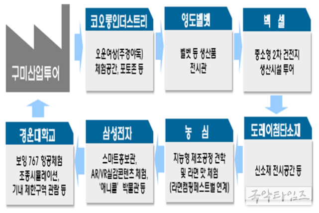 장세용 구미시장은 “이번 산업관광 육성사업 최종선정에 함께 노력한 7개 산학 컨소시엄 대표들께 감사를 표하고, 교육‧체험 중심의 제조업 연계 산업관광 서비스 발굴과 생산제품 전시 판매를 위한 전용 판매장 조성 등 다양한 기업과 소비자간 거래를 연계한 관광콘텐츠 개발로 관광도시 브랜드 창출에 노력하겠다”고 전했다.