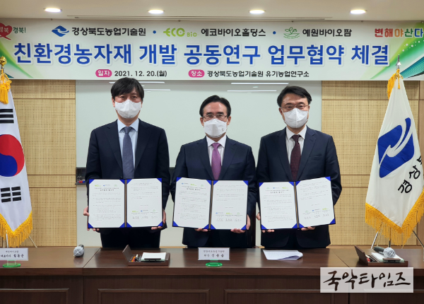 협약식에는 신용습 경북농업기술원장, 송효순 에코바이오홀딩스 회장, 설동근 예원바이오팜 대표이사 등이 참석했다.