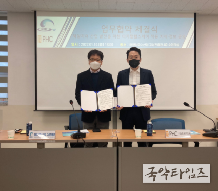 국악타임즈 황원일 기자 | 해양심층수산업 고성진흥원은 지난 1월 10일 디지털헬스케어기업 ㈜피에이치씨와 상호 신뢰를 바탕으로 한 업무제휴 협약(MOU)을 체결했다.