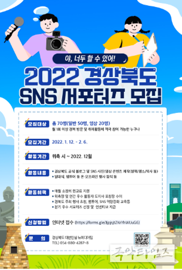 국악타임즈 황원일 기자 | 경상북도가 이달 12일부터 내달 6일까지 지역을 홍보할 공식 SNS 서포터즈를 모집한다고 밝혔다.