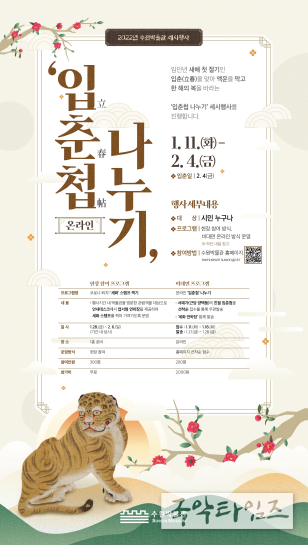 국악타임즈 황원일 기자 | 수원박물관이 임인년 첫 절기인 입춘(立春, 2월 4일)을 맞아 액운을 막고 복을 기원하는 세시(歲時) 행사 ‘입춘첩 나누기’를 연다.