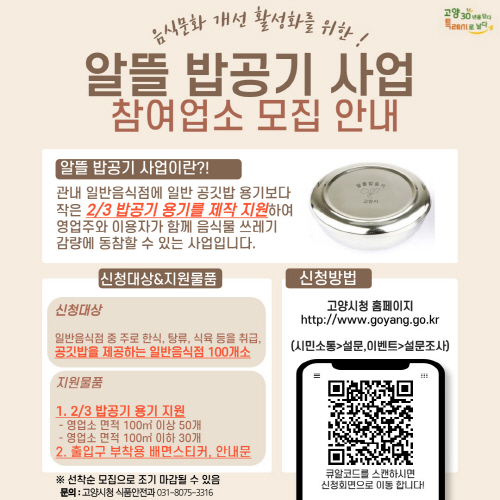 신청 대상은 고양시에서 일반음식점을 운영하며 주로 한식, 탕류, 식육 등을 취급, 공깃밥을 제공하는 영업 형태로 해당 사업을 적극적으로 실천할 의지가 있는 업소이다.