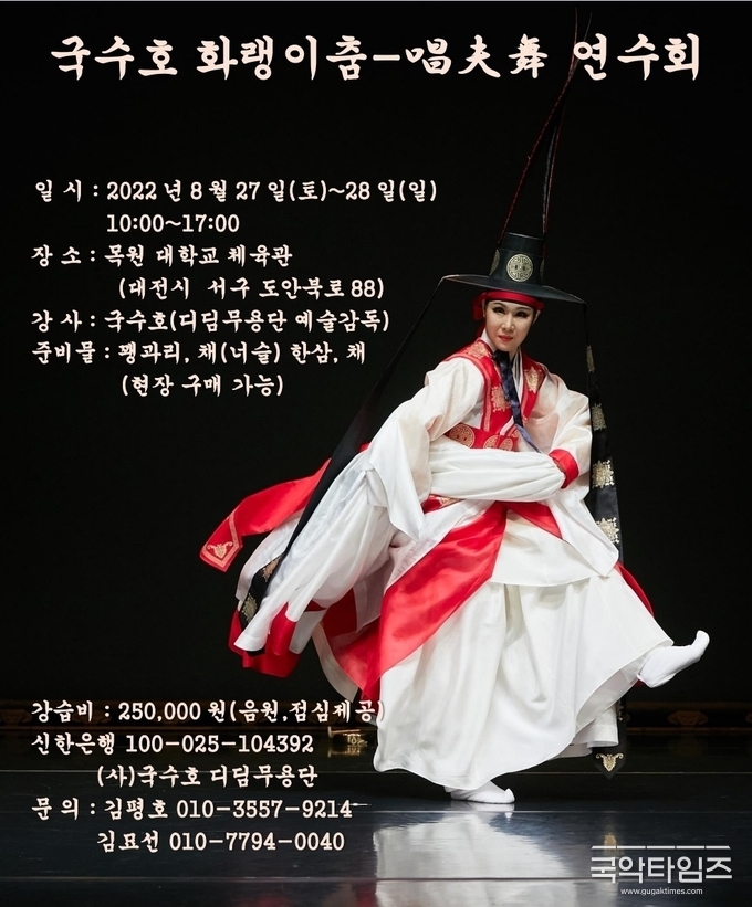 2022년 8월 27~28일(토, 일) 대전 목원 대학교 체육관에서 국수호 화랭이춤-唱夫舞 연수회를 개최한다.