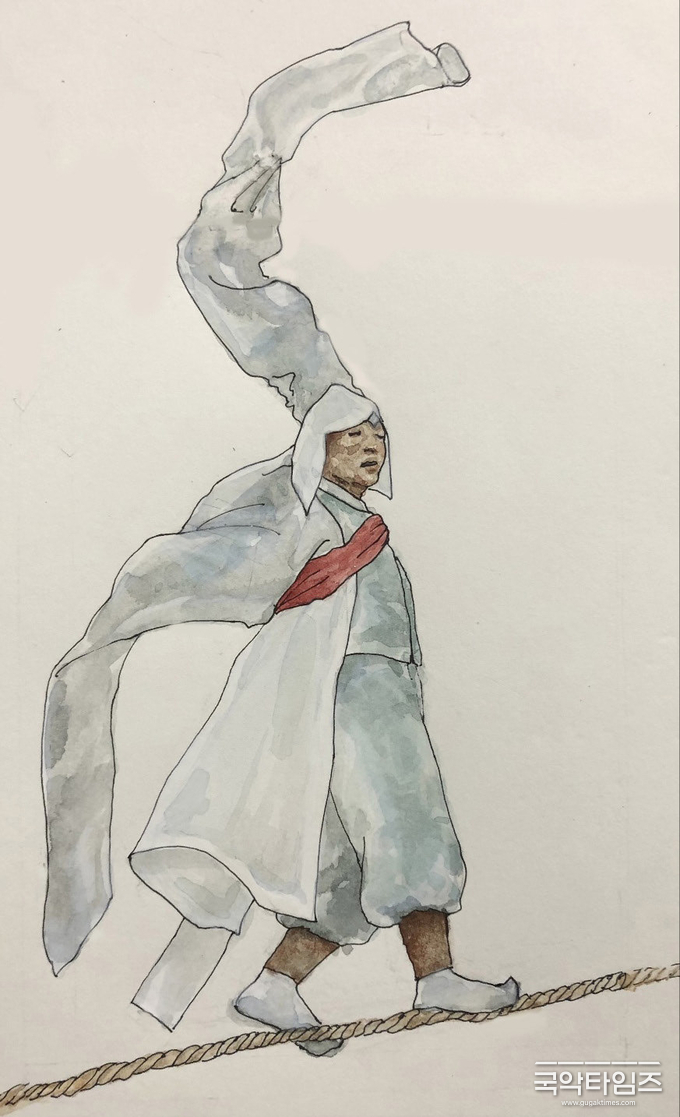 그리고 덧붙여서 사진 한 장을 소개한다. 이 사진을 발견한 것은 이 책의 원고가 출판사로 넘어가 교정본이 나오기 직전이었다. 태평무 관련 자료를 정리하던 중, 스승의 마지막 여인이셨던 안남국 사모님이 나에게 유물로 건네주셨던 뭉치 속에서 발견한 것이다. 정체불명의 잡지에서 오려낸 이 사진에다 굳이 제목을 붙이자면 ‘줄 위의 승무’라 할 것이다. 다만 아쉬운 것은 해상도가 너무 낮아 안타까워하던 중에 애제자 박소은 양이 간결한 소묘로 선명성을 살려낸 것이다.