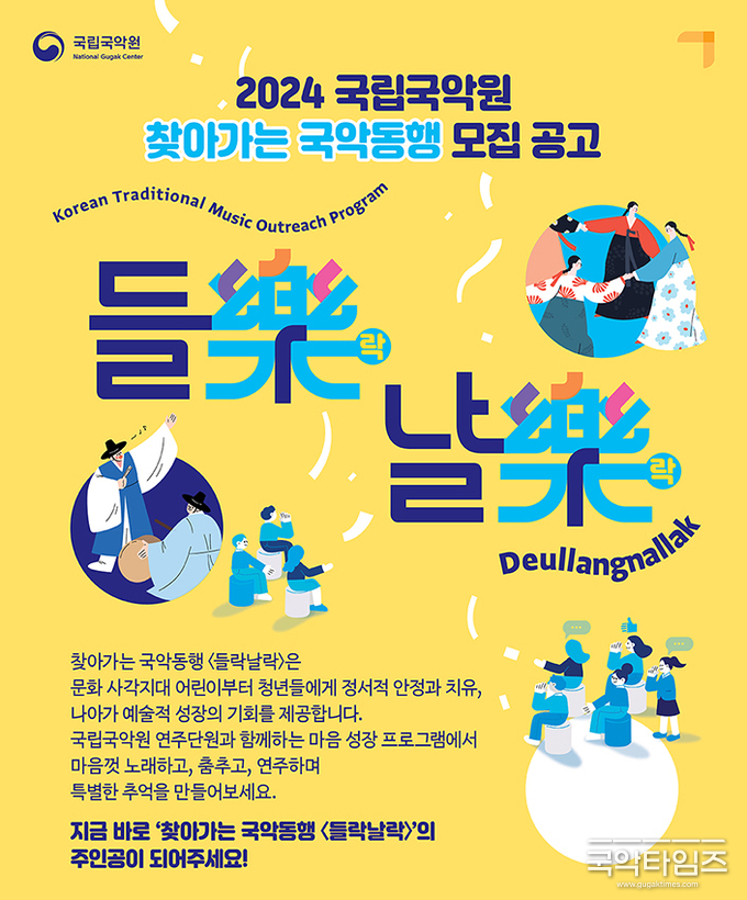 국립국악원(원장 김영운)이 정악단, 민속악단, 무용단, 창작악단 등 4개 소속 연주단의 단원들과 함께 문화 사각지대의 아동·청소년을 대상으로 하는 국악 체험 프로그램 ‘찾아가는 국악동행: 들락樂날락樂’(이하, ‘들락날락’)에 신청할 기관을 오는 3월 20일(수)부터 22일(금)까지 모집한다.