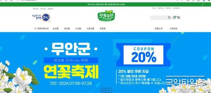 국악타임즈 송혜근 기자 | 전남 무안군은 제27회 무안연꽃축제를 기념해 농특산물 온라인 쇼핑몰 ‘맛뜰무안몰’에서 할인행사를 진행한다.