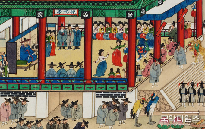 사자춤 이외에도, 흥겹게 춤추는 무희와 녹초삼을 입은 집박 악사의 모습이 보이며, 붉은 도포를 입고 앉아 해금, 대금, 피리, 장구, 좌고 등 삼현육각 편성으로 악기를 연주하는 악공들의 모습도 생생하게 담겨 있다. 마당에는 청학과 황학, 연꽃, 배 모형 등이 준비되어 있어, 학연화대합설무(鶴蓮花臺合設舞)와 선유락(船遊樂) 등의 공연이 이어질 것으로 추정된다. 생동감 넘치는 잔치 모습을 담은 ‘평안감사향연도’는 당시 음악 문화에 대한 깊이 있는 고증을 가능하게 해주는 소중한 자료라 할 수 있다.