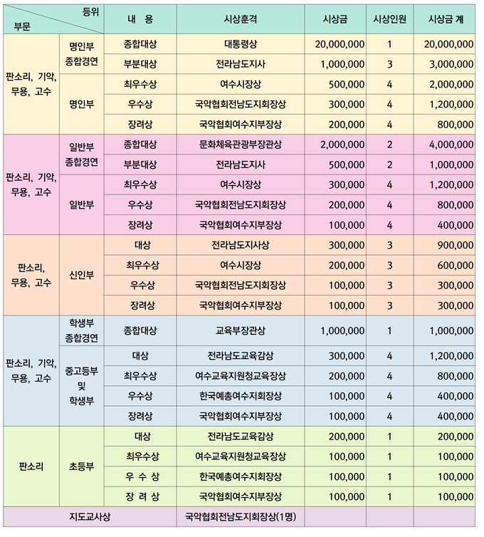※ 종합경연은 기악, 고수, 판소리, 무용 명인부, 일반부는 1위 입상자의 경연을 통해 순위결정.