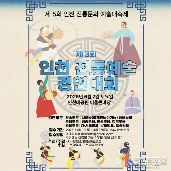 ※ 메일 제목과 파일명 : 대회명(인천전통예술경연대회)_분야(민속,무용,민요)_이름 혹은 단체명 순으로 기재