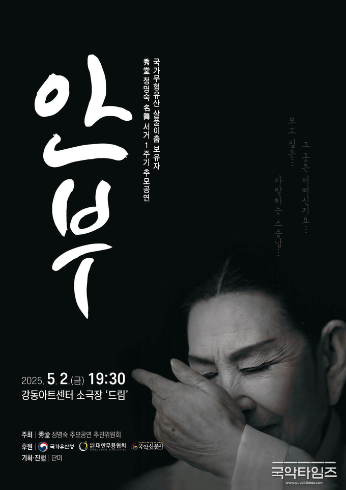한국 무용사에 빛나는 족적을 남긴 名舞 수당(秀堂) 정명숙 선생의 서거 1주기를 맞아, 제자들이 스승을 기리는 추모공연 ‘안부’가 오는 5월 2일(금) 오후 7시 30분, 서울 강동아트센터 소극장 ‘드림’에서 열린다.