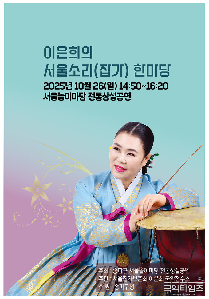 서울 송파구가 주최하는 2025년 서울놀이마당 전통상설공연의 일환으로, 오는 10월 26일(일) 오후 2시 50분부터 4시 20분까지 ‘이은희의 서울소리(잡가) 한마당’이 개최된다. 이번 공연은 서울잡가보존회와 이은희 국악전수소가 주관하며, 송파구청이 후원한다.