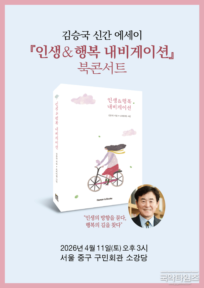 김승국의 신간 에세이 『인생&행복 내비게이션』 출간을 기념하는 북콘서트가 오는 4월 11일(토) 오후 3시, 서울 중구 구민회관 소강당에서 열린다. 이번 행사는 음악과 대화가 어우러진 문화예술 프로그램으로 구성되어 관객과 함께 호흡하는 자리로 마련된다.