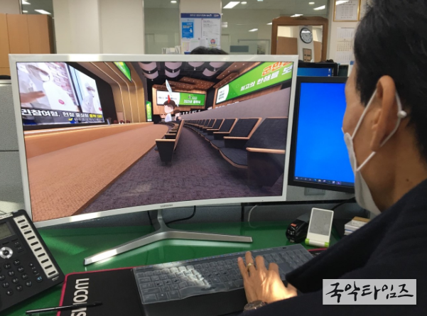 직원들은 미리 임의로 만들어 놓은 아바타를 선택해 가상의 문화예술회관 공간에서 자리를 찾아 앉았다. 가상의 공간은 실제 코로나19 이전에 매달 1일 월례회의가 열렸던 군청 내 현실의 문예회관 공간과 완벽하게 똑같았다.