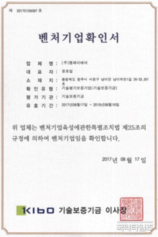 스프레이 제품중에서는 LPG(액화가스) 스프레이 와는 달리 인화성, 폭발성이 없는 유일하게 국제 항공기내에서도 휴대가 가능한 엠제이에어 플라스틱 공기스프레이는 지난 2017년 8월과 9월에 그야말로 혁신기술로 평가받아 벤처기업확인과 기술평가 우수기업 인증서로서 국가 인정을 받았다.